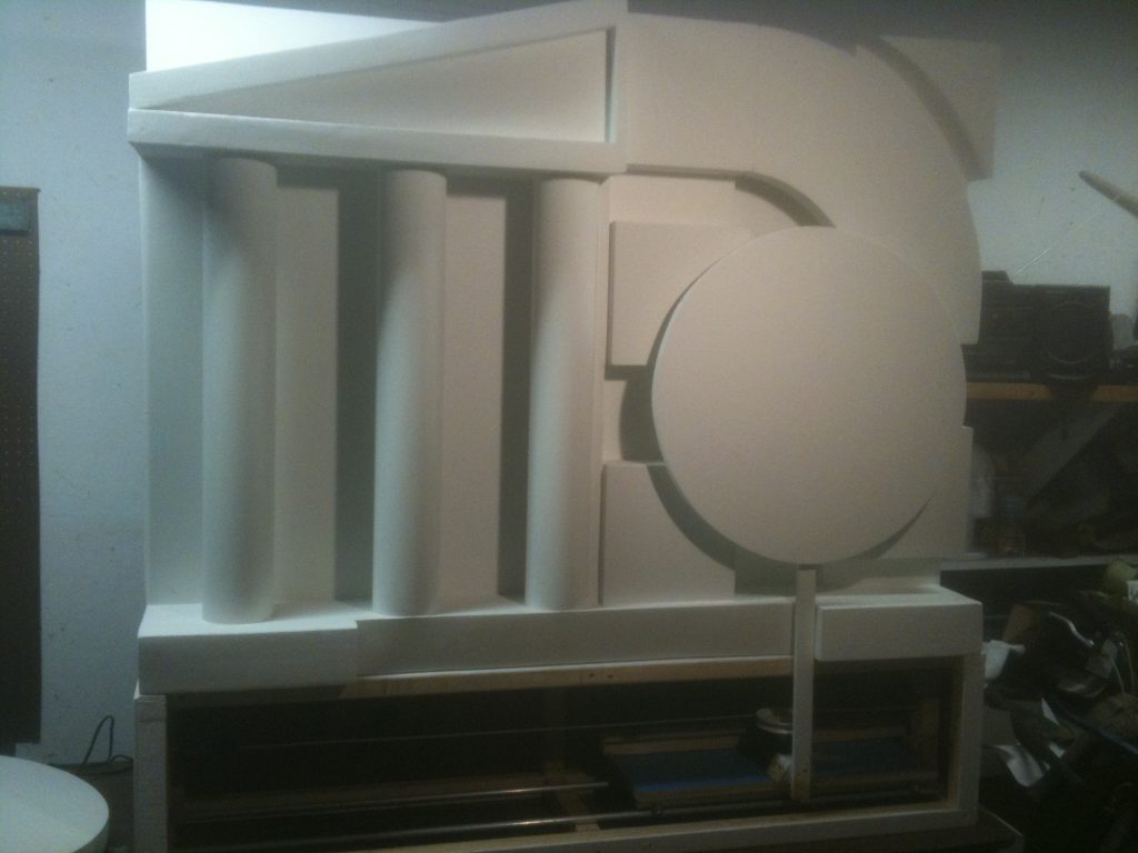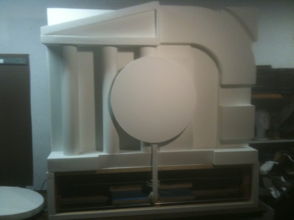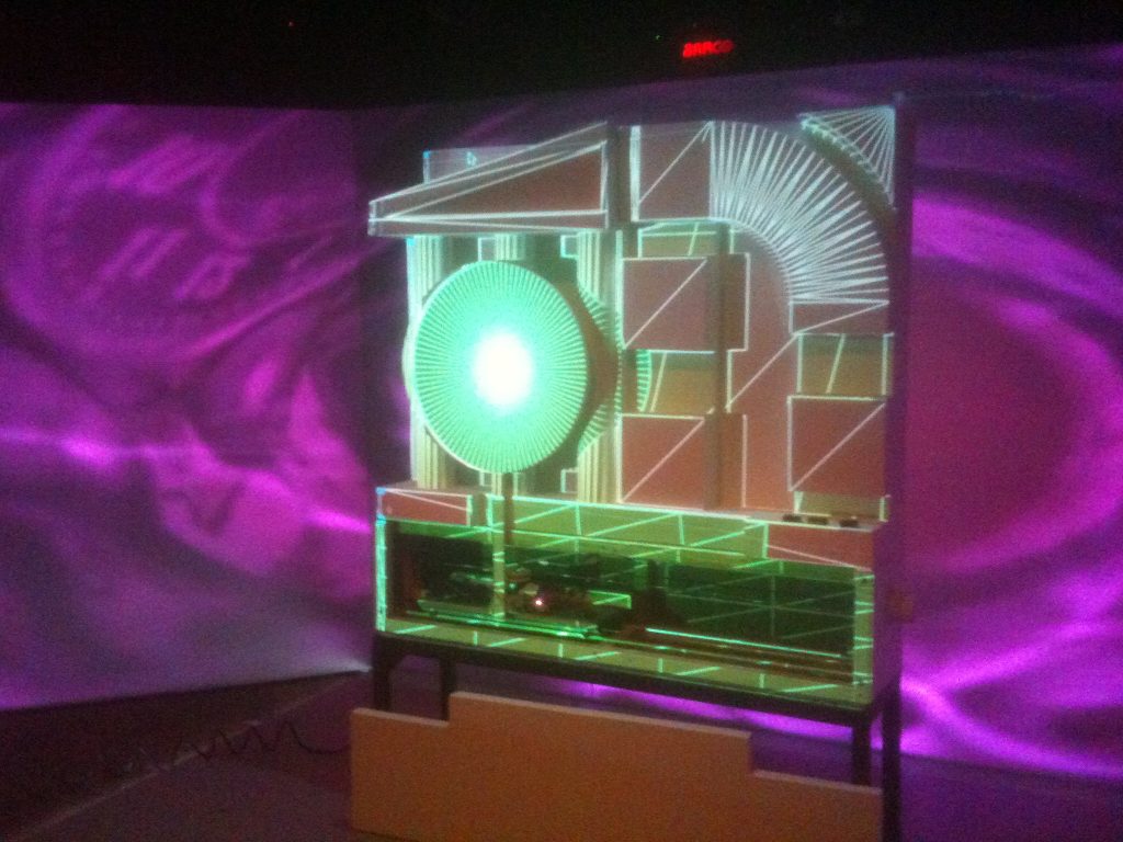 - The sculpture included a motorized sled at the base, which moved a circular projection screen in front of the piece — built using microcontrollers, a few motors, some salvaged pulleys and cables from a workout bench, and skateboard bearings