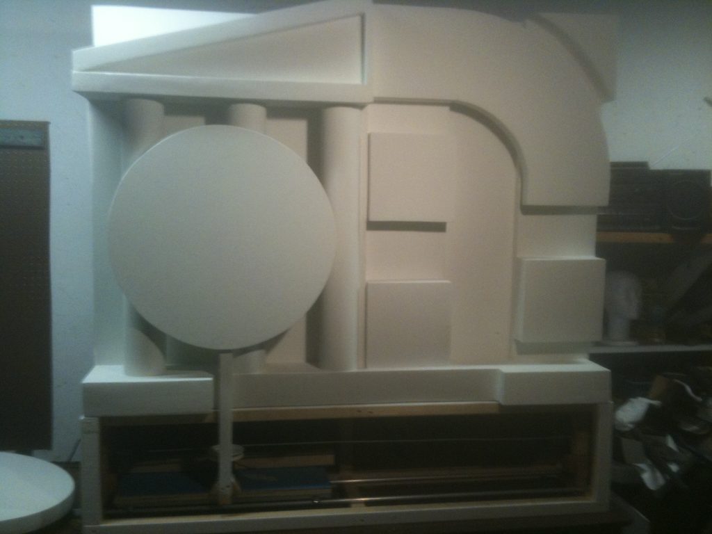 The sculpture was made from foam, wood, and PVC, with two contrasting sides: